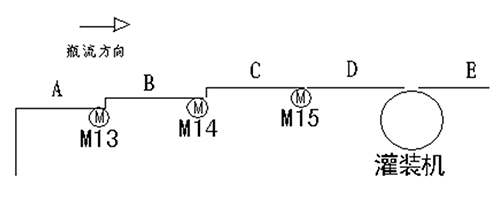變頻器1﹑2﹑3的調(diào)速方式為兩種:1.來自灌裝機(jī)主機(jī)變頻器的模擬信號DC0~10V,經(jīng)過隔離器轉(zhuǎn)換為線性DC0~10V,再經(jīng)過電位器分壓作為變頻器1﹑2﹑3 的給定信號,以控制電機(jī)M13﹑M14﹑M15,這樣可以做到輸送帶與灌裝機(jī)的速度很好匹配;2.采用多段速控制端子SD﹑STF﹑RL﹑RM﹑RH,通過PLC編程,由PLC發(fā)出控制信號以控制速度。PLC根據(jù)灌裝機(jī)操作臺發(fā)出的信號來判斷使用那種速度控制方式,又根據(jù)瓶流情況選擇高低速。在模擬信號控制時(shí)是通過輔助繼電器KA1和KA2,KA3和KA4,KA5和KA6的組合,經(jīng)W1﹑W2,W3﹑W4,W5﹑W6分壓控制變頻器輸出速度。在多段速時(shí)通過PLC的輸出Y10﹑Y11﹑Y12﹑Y13,Y20﹑Y21﹑Y22﹑Y23,Y24﹑Y25﹑Y26﹑Y27分別調(diào)節(jié)各個(gè)變頻器的輸出頻率以達(dá)到多段輸送帶的速度匹配及與灌裝機(jī)的速度匹配。在模擬控制方式調(diào)整中,電位器分壓比的調(diào)整是個(gè)關(guān)鍵,通過生產(chǎn)調(diào)試中摸索,終于找到了比較好的速度匹配。分壓比一旦調(diào)好,不得隨意改動。