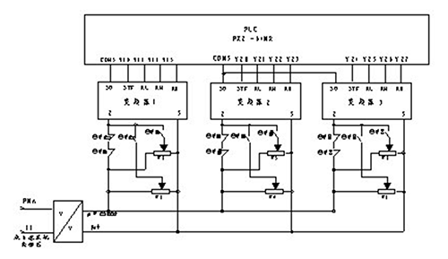 深圳某啤酒生產(chǎn)廠使用三菱變頻器FR-A540E為主要核心設(shè)備對該廠灌裝生產(chǎn)線輸瓶帶的調(diào)速要求進(jìn)行部署。三菱變頻器外部端子調(diào)速可分為模擬量調(diào)速和多段速調(diào)速。模擬量調(diào)速可用電壓DC0~10V或電流DC4~20mA,進(jìn)行無級調(diào)速。我廠用0~10V模擬電壓作為給定量 ,進(jìn)行開環(huán)調(diào)速 ;多段速采用外部輸入端子 SD﹑STF﹑RL﹑ RM﹑RH,進(jìn)行三段速調(diào)速。RL﹑RM﹑RH是低﹑中﹑高三段速速度選擇端子,SD是輸入公共端,STF是啟動正轉(zhuǎn)信號。如圖3中,當(dāng)Y10,Y11有輸出時(shí),變頻器為低速運(yùn)行;當(dāng)Y10,Y12有輸出時(shí),為中速運(yùn)行;當(dāng)Y10,Y13有輸出時(shí)為高速運(yùn)行。變頻器2﹑3原理與此相同。三段速分別設(shè)置為15Hz﹑30Hz﹑45Hz。在模擬量調(diào)速時(shí),通過調(diào)整W1﹑W2的分壓比設(shè)置KA1閉合時(shí)變頻器高速運(yùn)行,KA2閉合時(shí)為低速運(yùn)行,當(dāng)KA1﹑KA2都斷開時(shí),變頻器為最高速;變頻器2﹑3原理與此相同。通過編程,PLC根據(jù)操作臺發(fā)出的信號,選擇控制方式:模擬量調(diào)速或多段速調(diào)速。三菱變頻器的多段速調(diào)速比模擬量調(diào)速有較高優(yōu)先級(1)。