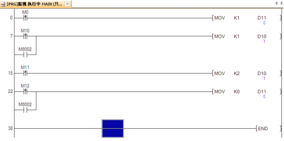 按下 M10 或初始化默認(rèn),給 D10 傳送值 1,使其顯示所設(shè)定一種語(yǔ)言。按下 M11,給 D10 傳送值 2,使其顯示另一種語(yǔ)言。