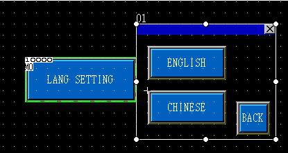 保存一下畫(huà)面,再次啟動(dòng)觸摸屏仿真。這時(shí)當(dāng)按下語(yǔ)言設(shè)定開(kāi)關(guān)時(shí),對(duì)話(huà)框出現(xiàn)在了指定位置。