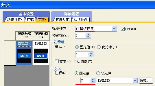 我們?cè)诖翱诋?huà)面中加入兩個(gè)開(kāi)關(guān)做語(yǔ)言切換和一個(gè)返回開(kāi)關(guān)。開(kāi)關(guān)的建立和第一個(gè)開(kāi)關(guān)建立相似,標(biāo)簽種類(lèi)都為注釋組標(biāo)簽,動(dòng)作都設(shè)為點(diǎn)動(dòng)。軟元件名分別為 M10、M11、M12。文本注釋 NO 的固定值分別為 2、3、4。