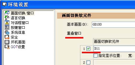 在環(huán)境設(shè)置對(duì)話(huà)框中,重疊窗口這一欄選中第 1 個(gè)復(fù)選框,然后在畫(huà)面切換軟元件中輸入一個(gè)字元件。其它地方不做修改,點(diǎn)擊確定。