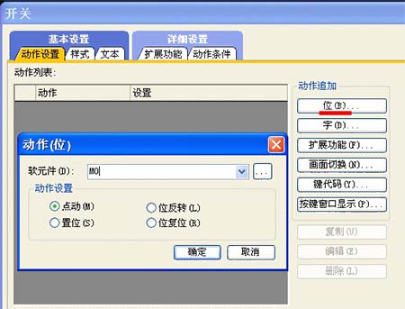 在動(dòng)作設(shè)置里面點(diǎn)擊位(B),輸入軟元件名:M0 并把動(dòng)作設(shè)置為點(diǎn)動(dòng),點(diǎn)擊確定。