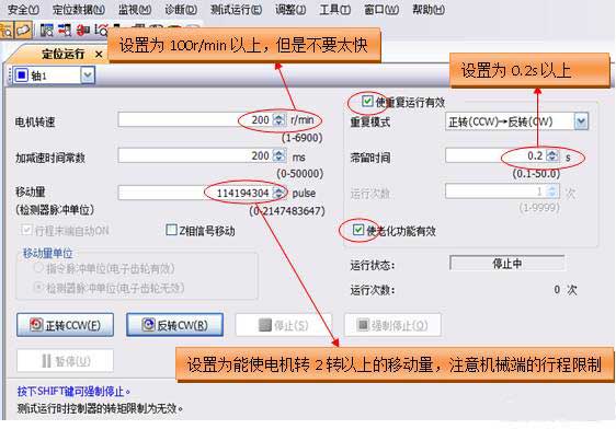 使用軟件MR-Configurator2,通過“菜單欄”-“測試運(yùn)行”-“定位運(yùn)行”打開以下窗口: