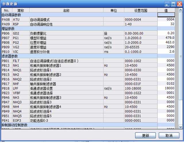 窗口中的三菱伺服參數(shù)即是伺服一鍵式調(diào)整時(shí)自動調(diào)整的參數(shù)。